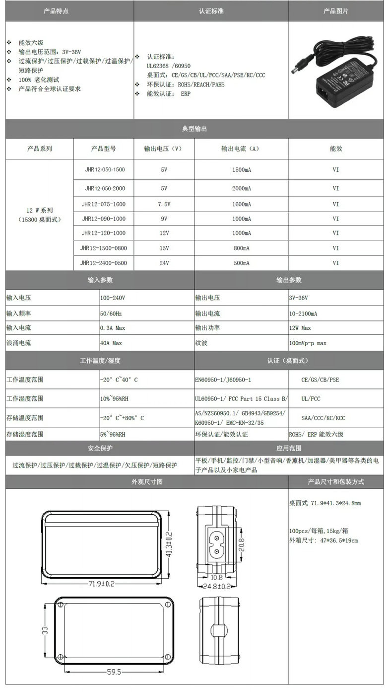 12w系列桌面式电源 24V500MA 60950/62368 多国认证能效电源