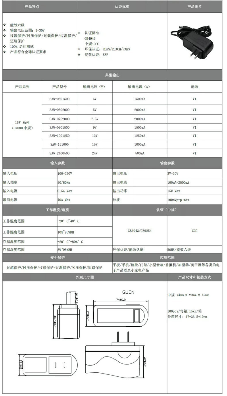 15w 系列插墙式电源适配器 15V1A 5V2A 30V0. 中规 5级认证电源