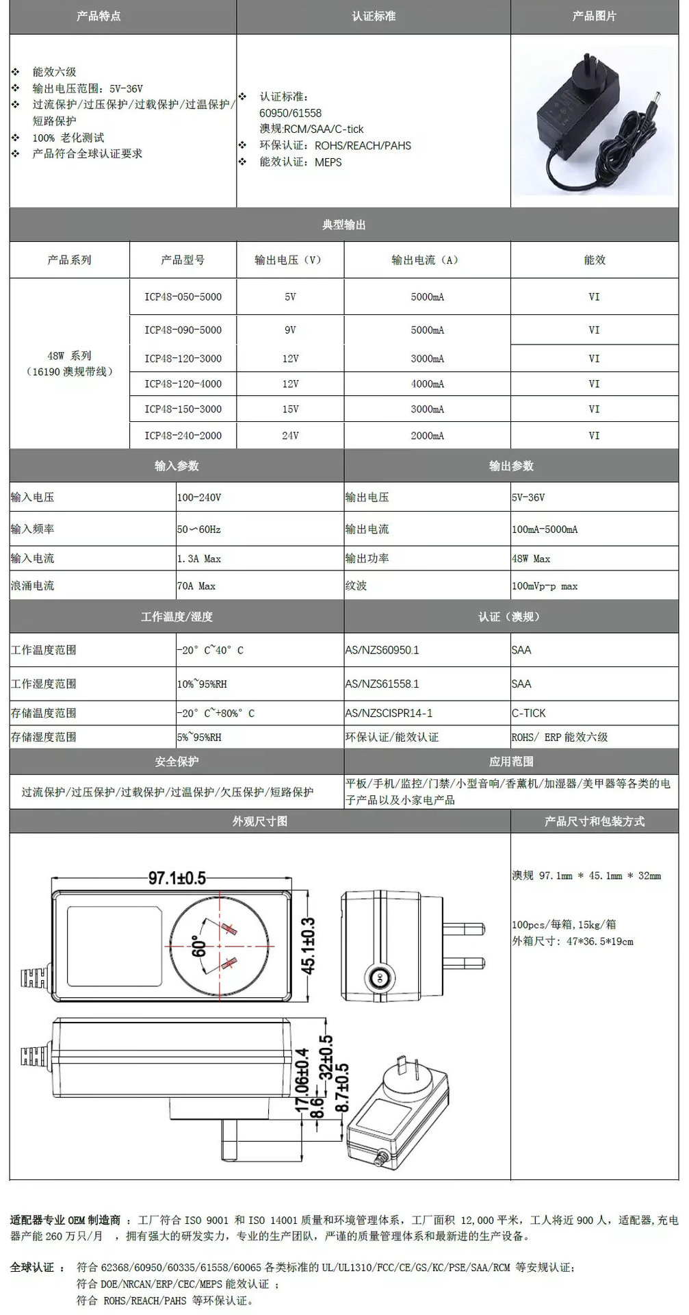 48w系列电源适配器 9V4A 12V4A 24V2A 20V2A 15V2A 澳规RCM电源