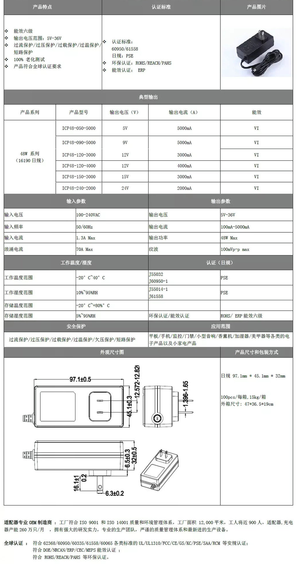 48w系列电源适配器 9V4A 12V4A 24V2A 20V2A 21V2A 日规PSE电源
