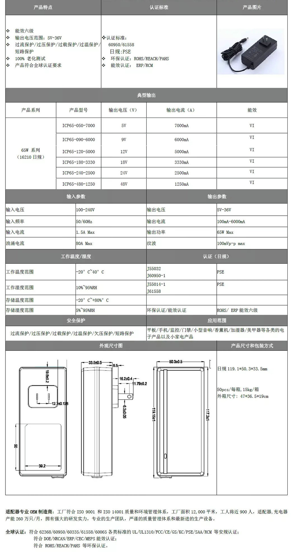 65w 系列插墙式电源10V 15V4A 24V2. 48V1.2 日规认证电源