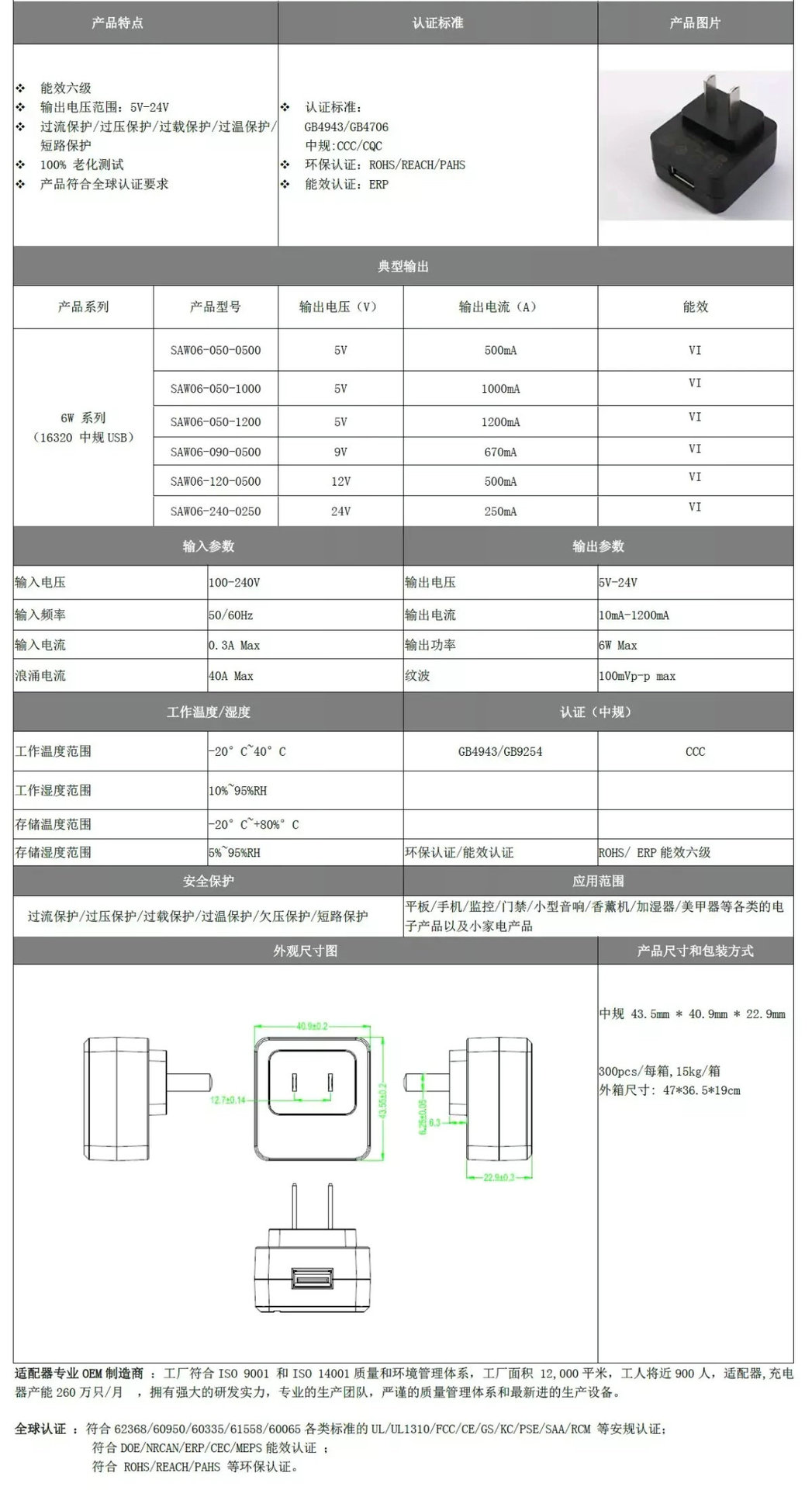 6W USB插墙式电源适配器 12V500MA 9V670MA 澳规 5V1..2AUSB电源