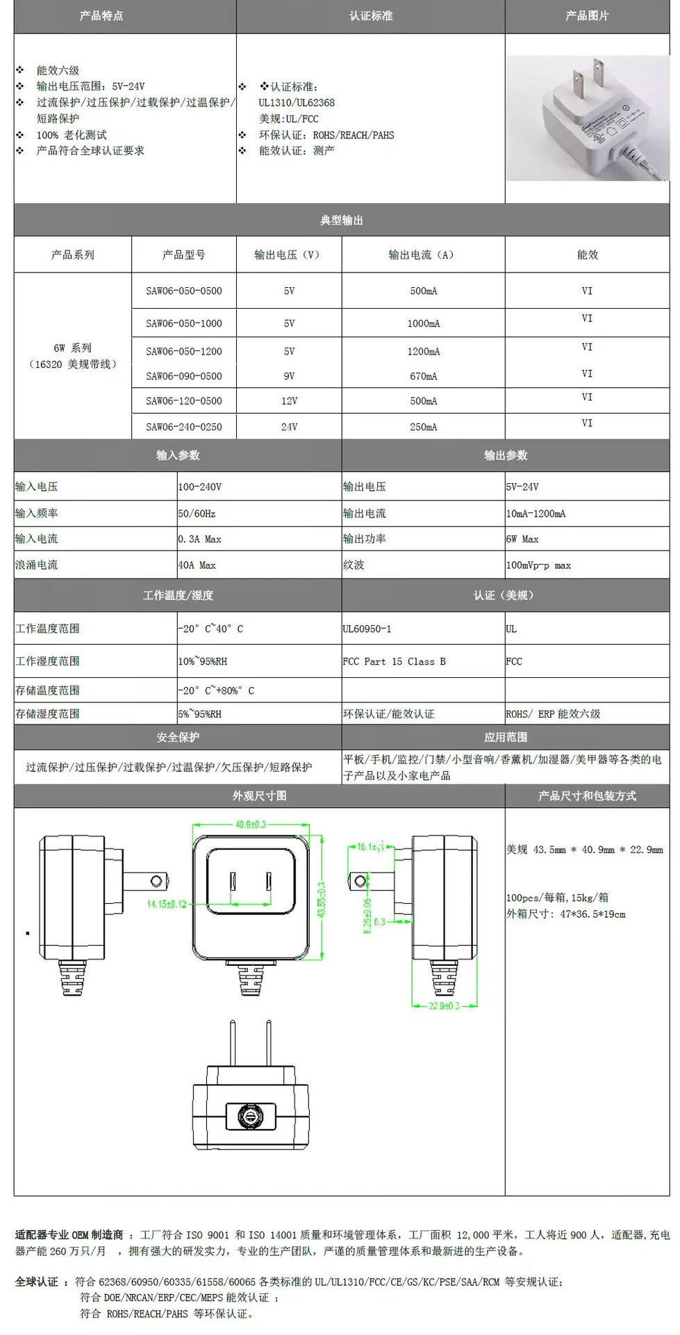 6W插墙式电源适配器 6v0.5a 12V500MA 15V400MA 美规电源适配器