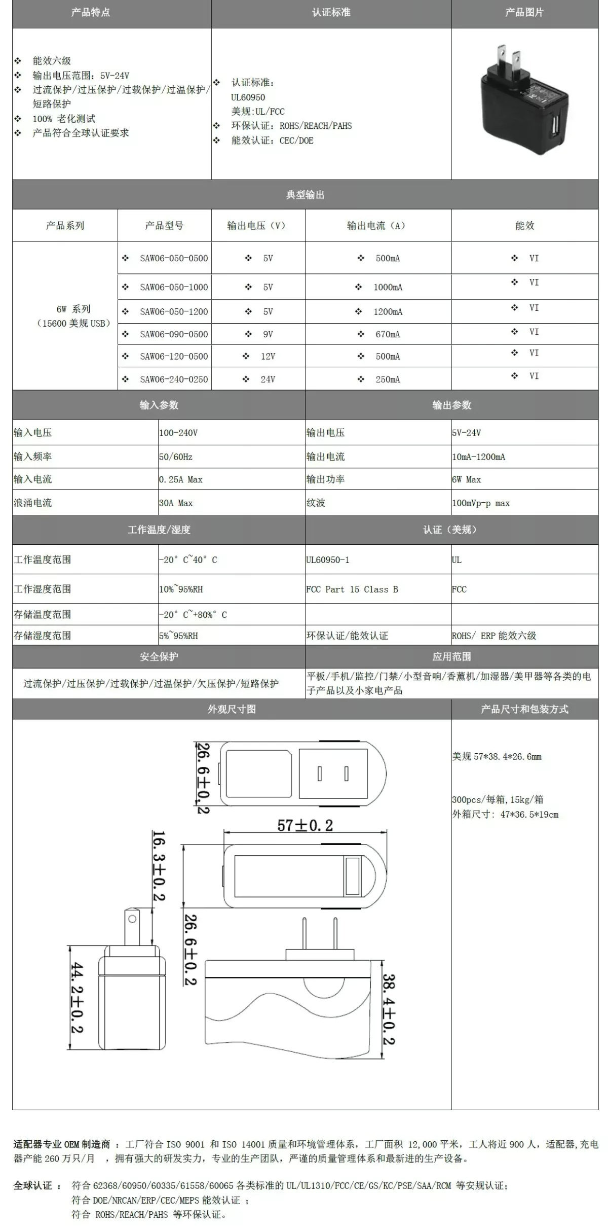 6W插墙式USB电源 5V1A 血压计电源 台灯电源 美规电源适配器
