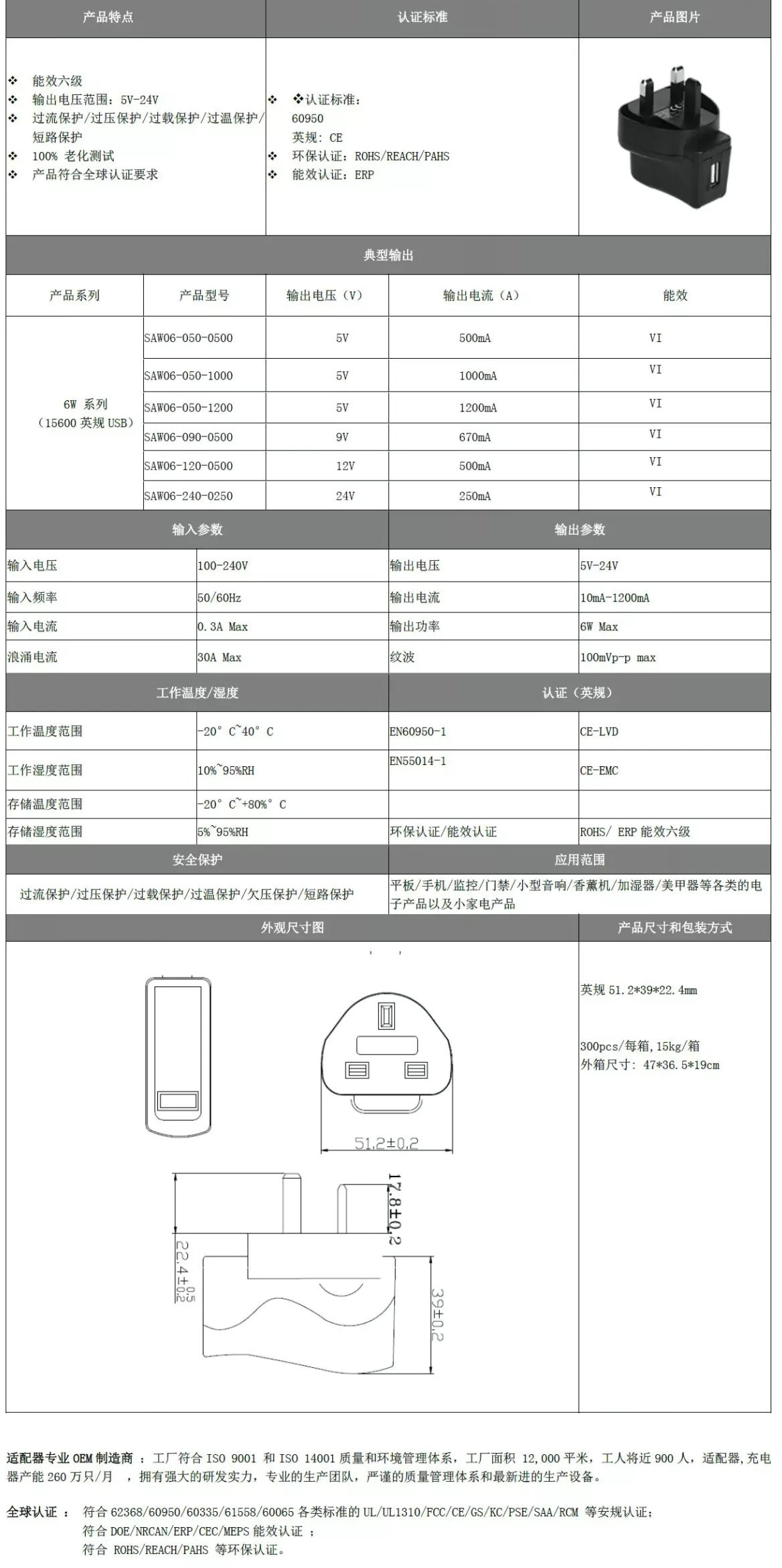 6W插墙式电源适配器 6v1a 12V500MA 24V250MA 欧规USB电源