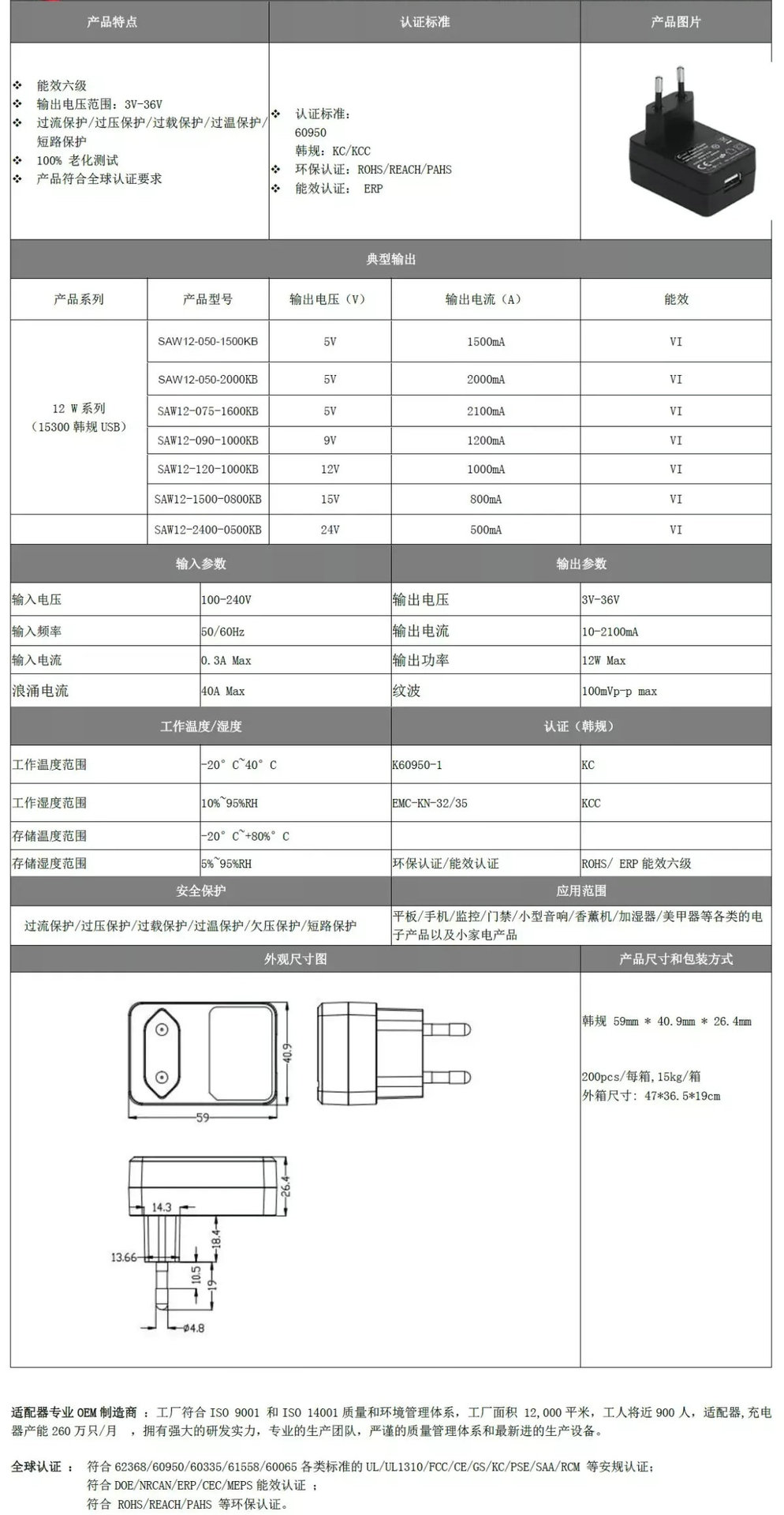 插墙式电源适配器 15300 (12w 系列) 15300-KR Plug (USB)
